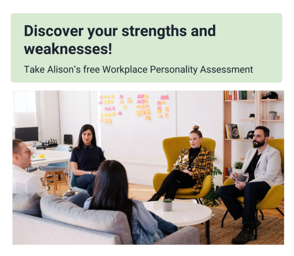 Designed by expert psychologists, Alison’s free workplace personality assessment enables you to realize your career dreams by providing you with an extremely accurate report of who you are and why you do things the way you do.