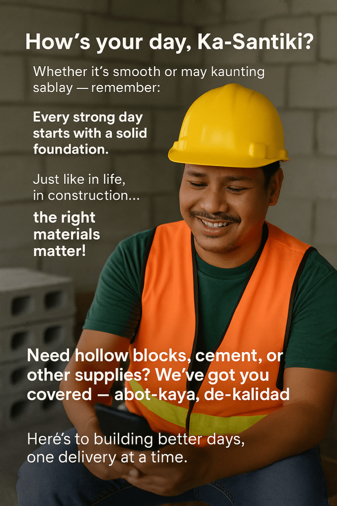 Just like in life, in construction… the right materials matter! Need hollow blocks, cement, or other supplies? We’ve got you covered — abot-kaya, de-kalidad!